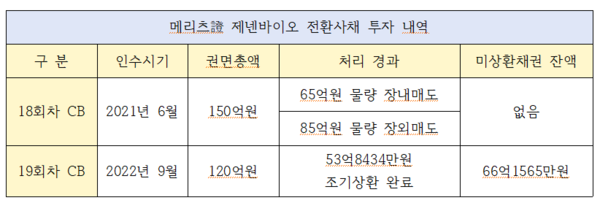 메리츠증권은 2022년 9월말 제넨바이오 19회차 CB도 단독 인수자로 120억원을 투자했다. 그러나 다음해 4월 제넨바이오가 외부감사 결과 한정의견을 받으면서 전환사채 인수계약서에 따라 풋옵션(조기상환청구) 사유가 조기에 발생했다.