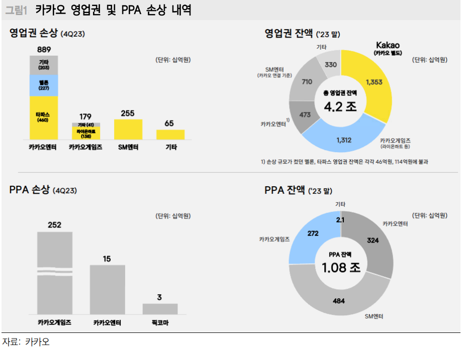 이 애널리스트는 “SM을 포함해 영업권과 PPA손상이 약 1조7000억원 반영됐다”며 “손상 중심이었던 카카오엔터 자회사와 카카오게임즈를 제외한 SM엔터 관련 무형자산 추가 손상 가능성은 낮아졌다”고 설명했다.