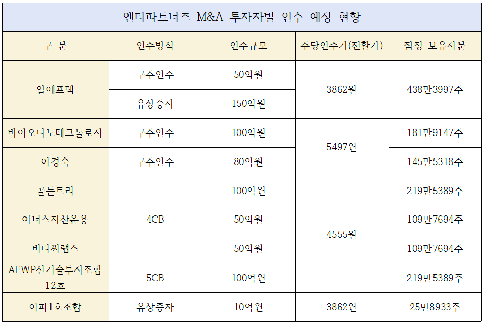 이 외에도 이달 26일 이피1호조합이 10억원 규모의 유상증자에 참여해 25만8933주를 획득하는 등 다수의 FI가 엔터파트너즈 M&A에 뛰어들고 있다.
