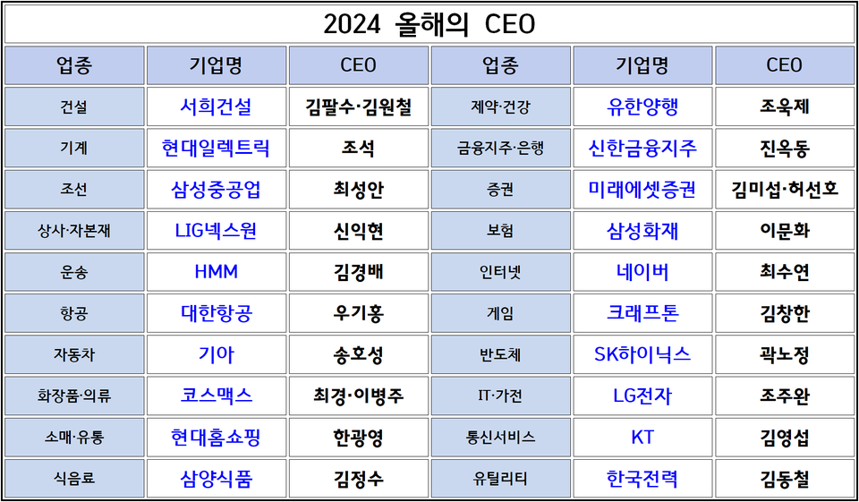 포브스가 선정하는 ‘세계에서 가장 영향력 있는 여성 100인’에 이름을 올린 최수연 네이버 대표(인터넷 부문), 올해 실적 신기록을 갈아치우는데 앞장선 김창한 크래프톤 대표(게임 부문), 역대급 실적을 견인하고 있는 곽노정 SK하이닉스 대표(반도체)도 올해의 CEO에 뽑혔다.