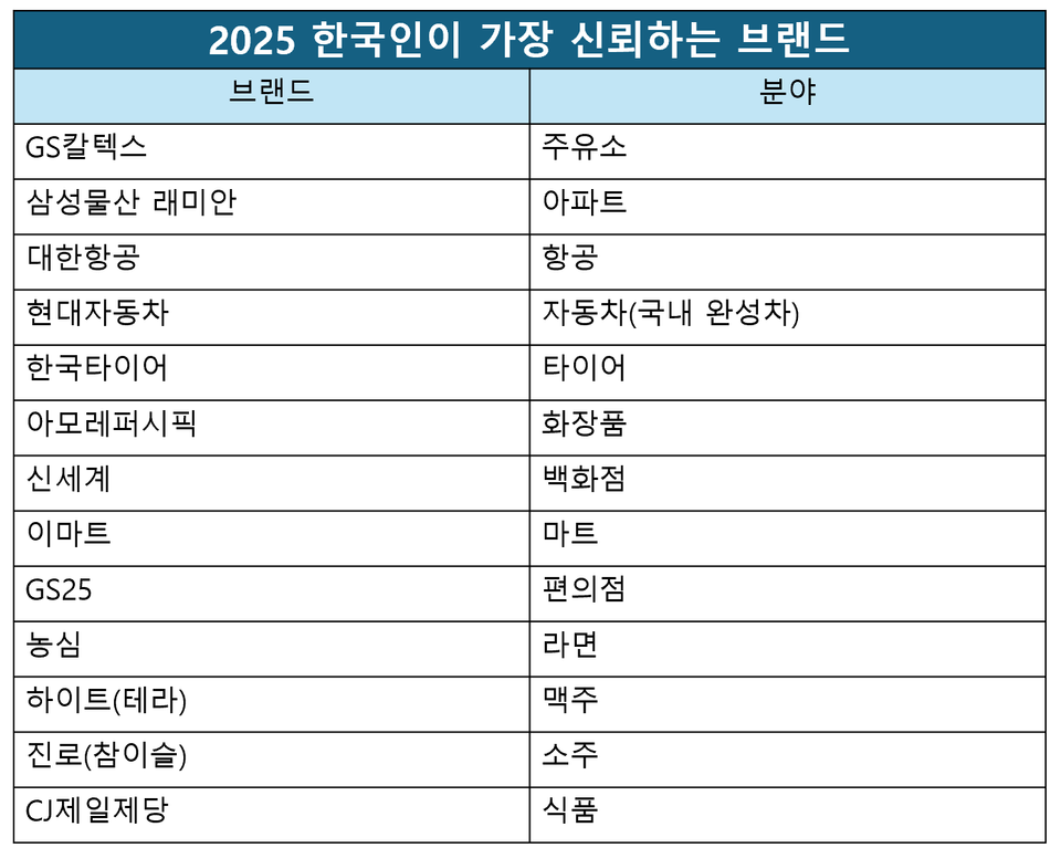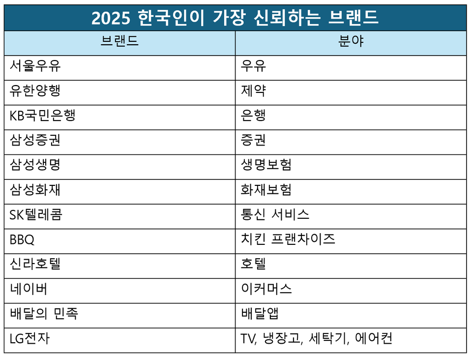 ※ 가장 신뢰하는 브랜드, 어떻게 선정했나 – 한국인이 일상 속에서 많이 소비하는 제품의 브랜드 28개를 대상으로 설문조사를 실시했다. 항목별 설문 대상 브랜드는 업종별 매출액 상위 기업 브랜드와 소비자 인지도가 높은 브랜를 대상으로 했다. 매출액 상위 기업 선정은 2024년 연간 매출액을 기준으로 삼았으며, 자료는 금융정보 기업 에프앤가이드로부터 제공 받았다. 설문조사는 글로벌리서치가 맡았으며, 8월 7일부터 12일까지 6일 간 전국 만 19~69세 남녀 400명이 각 항목별로 가장 신뢰하는 브랜드를 1개씩 선정하는 방식으로 진행했다.